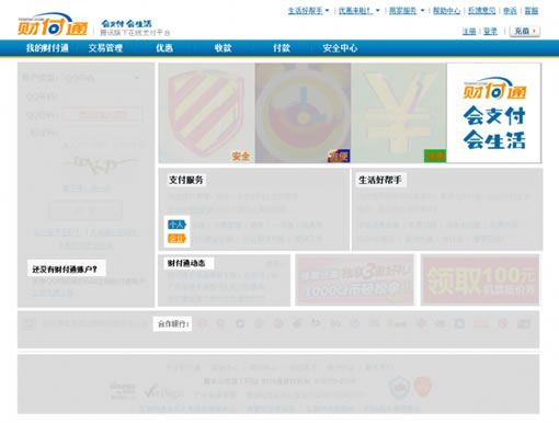 財富通:支付服務(含個人和企業),生活好幫手,還沒有財富通帳戶,支付好幫手,合作銀行,共5塊主要內容,兩個廣告區。