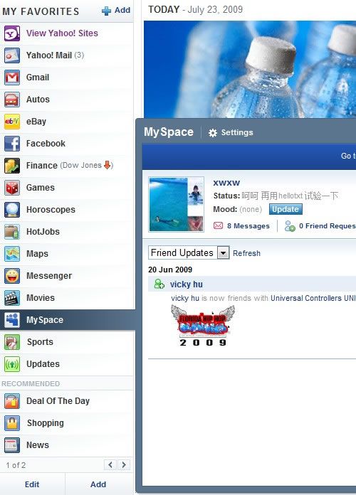 所以為了凸顯門戶網站的搜索特性,所以上面說道搜索部分采用了新的設計。而為了凸顯門戶網站目錄的特性,雅虎這次改版也從新設計了左側導航。左側導航不僅可以自定義雅虎本身提供的服務,還可以自定義當下其它站點的服務,譬如ebay,facebook,mysapce等。而這次雅虎最關鍵的一點不僅是解決定制的問題,而且還試圖解決信息問題。就是說不僅希望用戶可以自定義網站目錄,而且還可以在上面處理這些站點的信息。