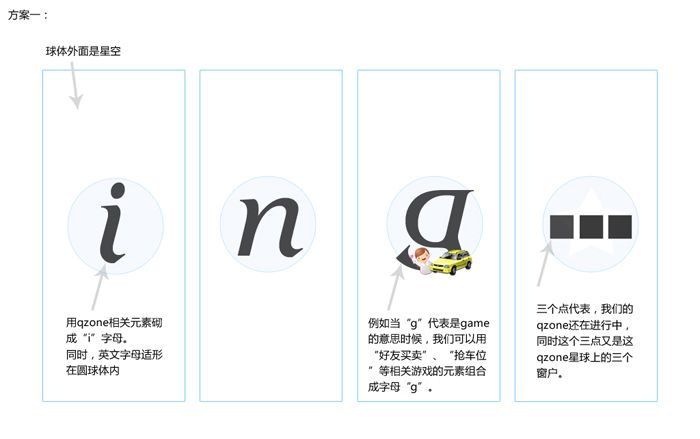 在構思logo的設計時,首先把現有的能代表空間元素和發(fā)散想象的與活動主題相關的元素都羅列出來,比如空間固有元素星球、五角星、代表”Qzone”的Z;結合活動主題構想的元素有文字“Qzoneing”、彩帶、光環(huán)、皇冠等等;接下來就是這些關鍵詞視覺化并相互碰撞組合成新的圖形。把覺得滿意的構思從草圖中篩選處理進行繪制。