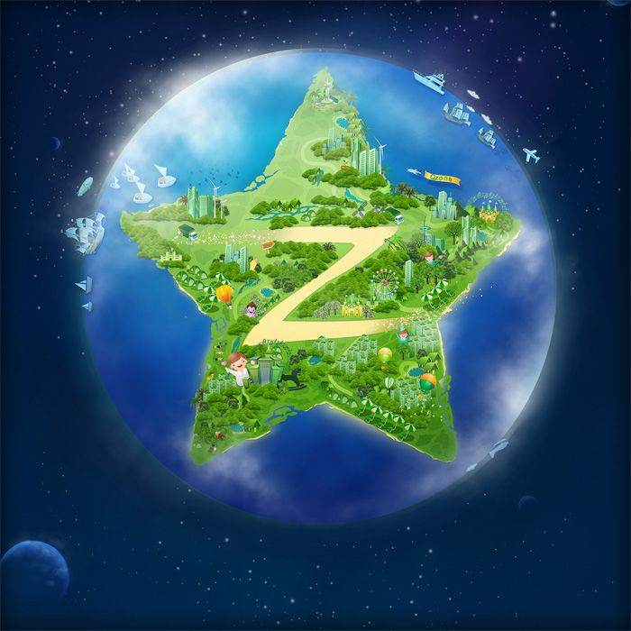 這樣的表現形式得到了大家一致認同,不過“ing…”代表什么意思吶?恐怕很難讓人馬上理解。形式很好,內容需要優(yōu)化!因此我們沿著這個方向發(fā)散,從內容上考慮新的表現。就這樣地球村的想法孕育而出。空間SNS平臺聯系著千萬用戶,我們在空間里寫日志、貼照片、停車、種水果、買賣好友…地球村這不正好是Qzone最好的表達嗎?想法出爐后,時間緊迫,熬夜是必然了。星球、綠地、樹、房子、道路,地球村漸漸有了模樣。