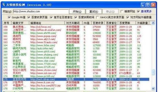 友情鏈接做好不代表萬事大吉,因為也許對方網站會無故取消自己的鏈接,或者對方網站出現了問題,不再適合與自己做鏈接。所以需要經常性地去檢測友情鏈接的有效性。但是網站友情鏈接動輒幾十個,手工檢查太過麻煩。可以使用一款名為“友情鏈接檢測”的軟件進行自動批量檢測。