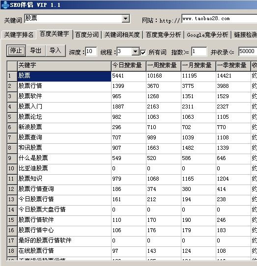 以前百度會提供相關(guān)搜索更多頁面,但是后來被百度關(guān)閉了,只有競價(jià)用戶才能看到,這部門關(guān)鍵字?jǐn)?shù)據(jù)是非常有用的,之后便產(chǎn)生了很多的關(guān)鍵字選取軟件,軟件的數(shù)據(jù)來源是百度指數(shù),也就是原先的相關(guān)搜索,比如最常見的有SEO伴侶,SEO助手(這兩款都是付費(fèi)軟件)免費(fèi)的也可以用,但是出來的關(guān)鍵字很少,而且可能還被禁止導(dǎo)出,SEO伴侶我一直在用,價(jià)格一年也就幾十元,我記得好像是35元!SEO助手價(jià)格相對比較貴,但是里面除了這個(gè)功能外,其他功能還有很多,還有最新的一個(gè)網(wǎng)站叫追詞網(wǎng)(http://www.zhuici.com/ )這個(gè)網(wǎng)站不需要給錢,但是需要用一個(gè)PR=3的鏈接換取VIP會員級別,有資源的可以去用一下!下面我以SEO伴侶為示范,找出“股票”相關(guān)的關(guān)鍵字~~
