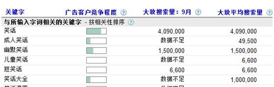 下面這個(gè)圖是GG關(guān)鍵字工具對(duì)“笑話”相關(guān)詞的搜索情況