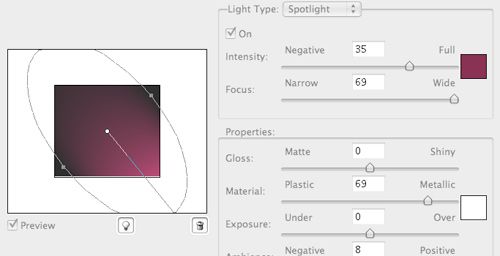 首先創(chuàng)建一個(gè)漂亮的背景。新建一個(gè)ps文檔,背景填充為黑色(D→Alt+Delete)。創(chuàng)建一個(gè)新圖層(Ctrl+Alt+Shift+N)并填充為白色(D→Ctrl+Delete)。下面將用“光照效果”濾鏡(濾鏡》渲染》光照效果)在這層上制作柔美的漸變效果。在強(qiáng)度調(diào)節(jié)旁邊,選擇你喜歡的任意顏色只要有一些深的顏色就可以。比如,我選擇了深粉色/紫色。