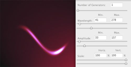 從這步開始變的很有意思。有兩個(gè)濾鏡可以使光效變的像光紋:波浪(濾鏡》扭曲》波浪)和(濾鏡》扭曲》旋轉(zhuǎn)扭曲)。用波浪可以制作各式各樣不規(guī)則的紋路。像其他濾鏡一樣,可以調(diào)節(jié)滑塊來取得理想的效果。但是或許應(yīng)該適當(dāng)調(diào)大波長和波幅。同樣,試著在同一圖層多次運(yùn)用“波浪” 濾鏡。