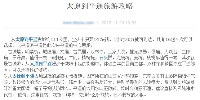 3,選擇能滿(mǎn)足用戶(hù)明確需求的關(guān)鍵詞:能體現(xiàn)用戶(hù)明確需求的關(guān)鍵詞往往字?jǐn)?shù)偏長(zhǎng),SEO人員一般稱(chēng)此為長(zhǎng)尾關(guān)鍵詞,如“杭州兩日游路線(xiàn)”“從上海到西塘怎么走”等。我們的產(chǎn)品人員和編輯應(yīng)該一方面了解用戶(hù)需求,一方面制作可以滿(mǎn)足用戶(hù)需求的網(wǎng)頁(yè),通過(guò)將含有用戶(hù)明確需求的關(guān)鍵詞寫(xiě)在標(biāo)題上來(lái)吸引搜索引擎用戶(hù)的點(diǎn)擊。